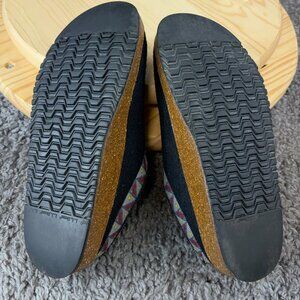 Comfortable black slip-on clogs featuring a colorful patterned trim. Perfect for casual wear.