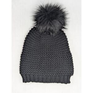 Black Slouchy Chunky Knit Beanie w/Faux Fur Pom and Fleece Lining by Rachel Zoe
