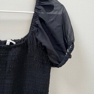 Elegant and romantic black maxi dress featuring a smocked bodice and dramatic puff sleeves with a sheer finish. The dress has a square neckline and a tiered, flowy skirt that creates a flattering silhouette for any occasion.