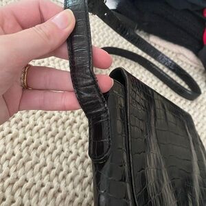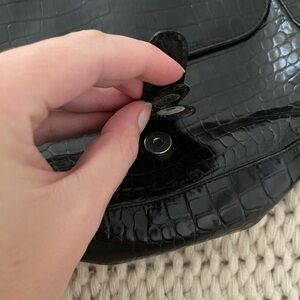 Please notice wear on edges, snap closure coming undone (but still closes), paint peeling off on inside of bag