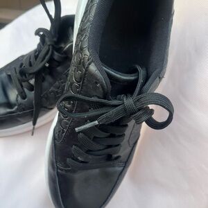 Stylish black sneakers featuring an embossed logo design. Comfortable and trendy.