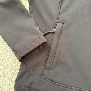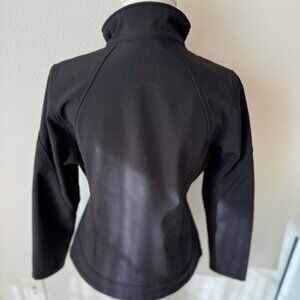 Cute black Snozu brand medium weight jacket. Comparable to a North Face with a fitted fit. Two slit zippered pockets. Stretch-O-Rama fabric with soft thin fleece on the inside.