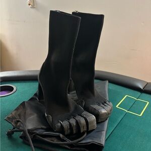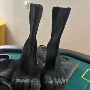 Stylish black sock boots featuring a chunky heel and unique sole design. Perfect for a modern look.
