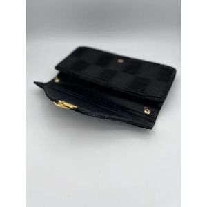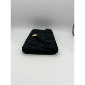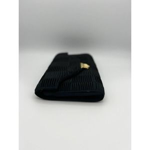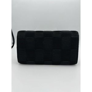 This black pleated envelope clutch features a checker pattern made of pleated material on the body and flap, plus a decorative snap closure. It could be a Nunn Bush Brand. It was kept in their logo plastic bag. The interior is lined and includes a small pocket.