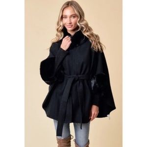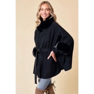 Black solid soft and fuzzy cape style coat with faux fur trim, armholes, hook and eye closure and a self tie belt.
