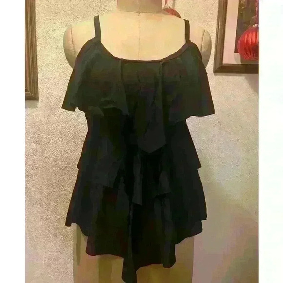 Black Solid Tiered Ruffle Adjustable Straps Swimsuit Tankini Top NWT Size L