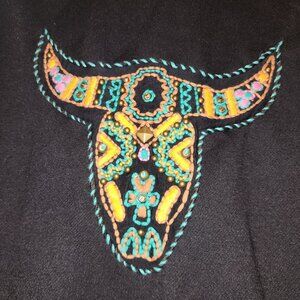 Southwestern-style zip-up jacket featuring intricate embroidery, bull and cross motifs, and vibrant stitching for a bold yet cozy look. Heavy weight fleece decretive jacket.