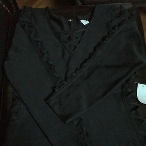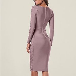 Features: Striking and slimming dress has trendy lace up details at the neckline and tough-chic details down the sides. Hits below the knee 43" ..large fits (12-14)