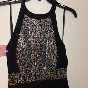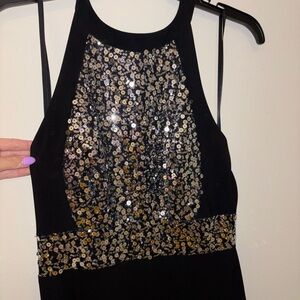 Brand: Blondie Nites by Stacy Sklar, Black Halter Top Silver Sequin Dress. Two hook/eye closure on the top of the neck line, Zipper/hook eye closure on the top back of dress. High Slit on bottom hem of dress. Great Condition, only worn once.