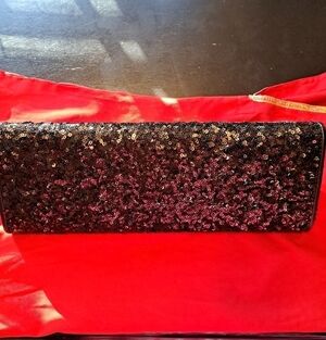 black envelooe style sequin clutch with a snap closure, clean inside with an open space, chain is missing, 11" x 4.5"