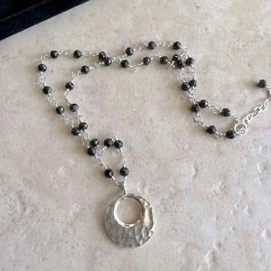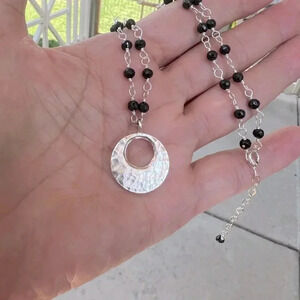 Black Spinel Necklace,Hill Tribe Silver,Hammered Disc Hoop