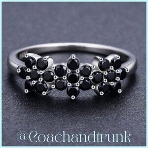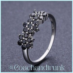 Black Spinel Prong Set 3 Flower Sterling Silver Band Ring Size 7