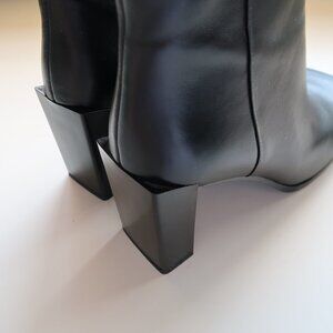 Super trendy black real leather square toe booties. Laconic, minimalist fashion. Very soft and comfortable. High block heel in a stylishly geometric shape. These booties will compliment all of your outfits whether it's a floral dress, jeans, or business costume.