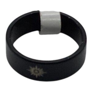 A sleek stainless steel ring in black with an intricate silver sunburst design. Wear-resistant and versatile, ideal for professional or casual settings.