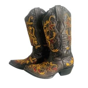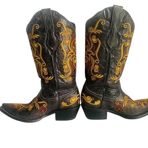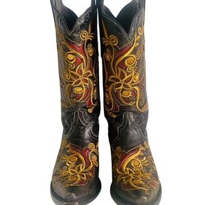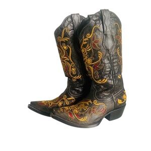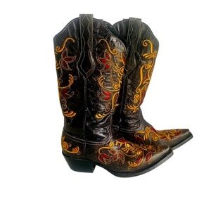 Black Star Women's Size 6 Floral Embroidered Black Leather Snip Toe Boots