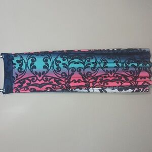This Boutique Brand Fold-Over Waistband Stretchy Maxi Skirt with Unfinished Hemline features a Unique Geo-Paisley Mix of Turquoise, Dark Blue, Hot Pink, White and Black Hues that will make you stand out from the crowd. Note: the print on this skirt is vertical rather than horizontal as in the stock photo, which is more slimming! Excellent Condition.