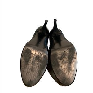 Black Bootie with leather upper and manmade sole, zip up closure, cinched look at toe