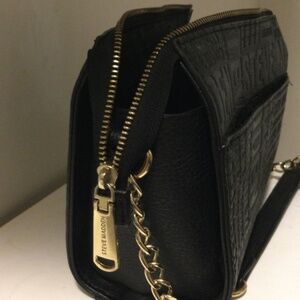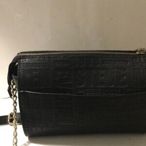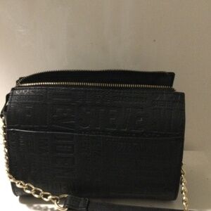 Striking black Steve madden crossbody with gold linings. Multiple pockets available for storage. Small bag in good condition.