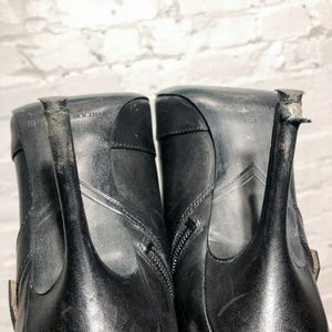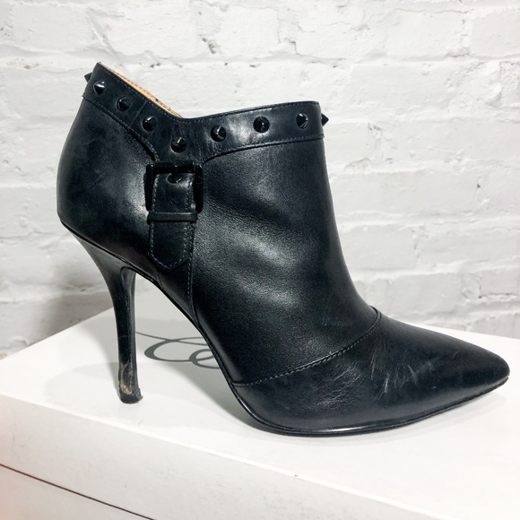 Super sexy, these stiletto booties look incredible on! These Enzo Angiolini boots have a spike heel, side zipper, black studs around the ankle, and a decorative side buckle. The body of the boot is in excellent condition, but the heels are in need of a little repair. They were only worn for a single event, however, the terrain was rough (hence the damage to the heel). There are no scuffs to the toe or to any other part of the boots.