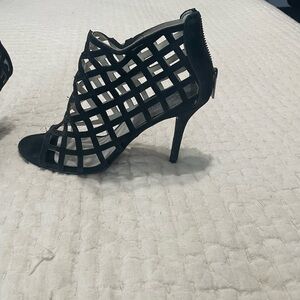 These black stiletto heels feature a striking cage-like design with crisscrossing straps that extend to the ankle, offering a chic and modern look. The open toe and sleek zipper closure at the back add both style and convenience, making them a perfect choice for a night out.