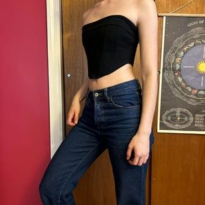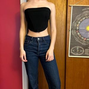 Black strapless crop top in a size S from Forever 21. Condition is excellent. Model is 5'5, 32C, and 110lbs.