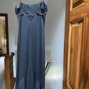 Black strapless dress that has light pink trim and pink sparkles. It has ruffles on the bottom and appears high low. Size Medium. Worn once.
