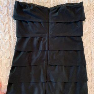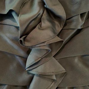 Black satin with layered ruffles and ruffle accent down front, zips up the back