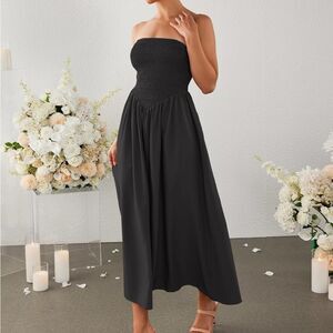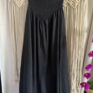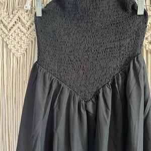 This black strapless smocked sundress is perfect for summer days and vacation nights. Features a stretchy, smocked bodice and a flowy A-line skirt with a ruffled hem for a flattering, easy fit. Size Small, fits true to size with a relaxed feel. In excellent used condition (EUC) — gently worn and well cared for.