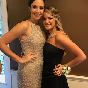 This black Strapless prom dress is very elegant with the stone on the side. This was worn once and there are no rips or deterioration. one of the most comfortable dresses I have worn and it does not fall down.
