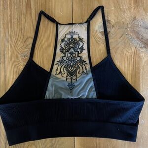 Stylish black strappy bralette featuring intricate embroidered mesh detail. Perfect for layering or wearing alone.