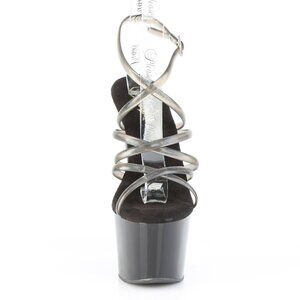 Elevate your look with these striking black strappy platform heels. Designed for a captivating silhouette, these shoes feature a dramatic 7” heel and a 2 3/4” platform. The sleek design with thin straps provides a confident and bold aesthetic, making them perfect for performances, nights out, and exotic dancing.
