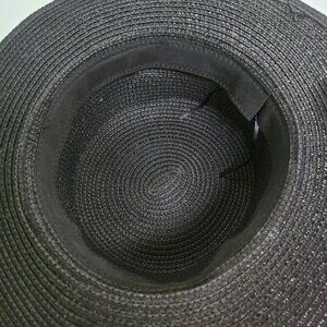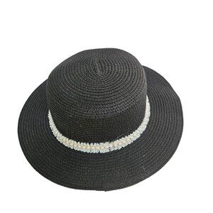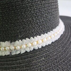 Black Straw Sun Hat Pearl Lace Trim One Size