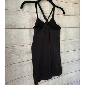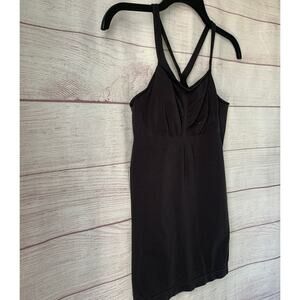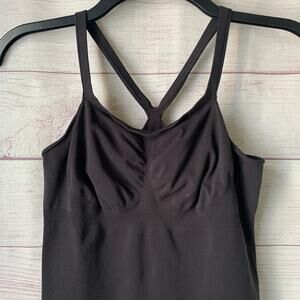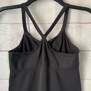 Black fitted and stretchy tank top. This tank feels like it is a shapewear material. It has a racerback with straps that split into shoulder straps and a ribbed band under the bust. It is pre-owned with a spot on the left cup and the hems in the armpits roll, but it is otherwise in great condition.