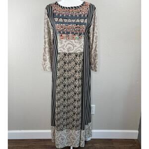 Black Stripe Floral Mixed Print 3/4 Sleeve Eclectic Boho Maxi Shift Dress Medium