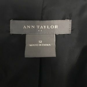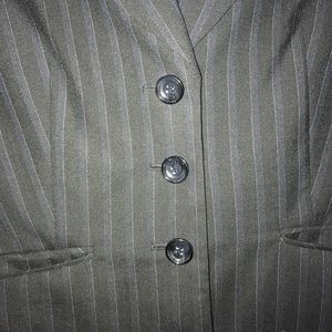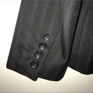 Black striped blazer with two front pockets. It has 3 buttons in the front and 4 buttons on each arm.