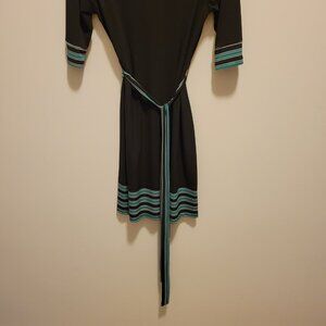 Chic and flattering black knee-length dress from In Focus Studio, featuring a collared neckline, V-cut front, and matching waist tie for a feminine silhouette. Accented with turquoise, white, and black striped trim on the neckline, cuffs, and hem for a stylish pop of color. Soft, stretchy fabric makes it easy to wear and perfect for work, casual outings, or travel.