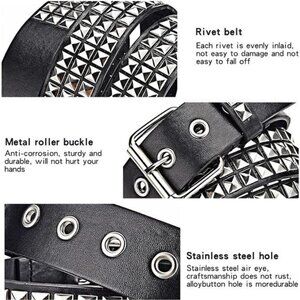 *【Punk Design】This classic pyramid punk rock rivet belt consists of a black buckle PU leather belt with cool silver buckles and three rows of pyramid-shaped metal inlays, which highlighting the rock punk design style.