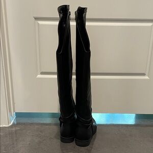 Elevate your style with these chic black knee-high boots. Featuring a sleek design with studded accents, these boots are perfect for any occasion. Zips up on inside of legs.