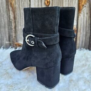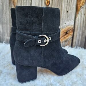 Black sueded leather upper, square toe, chunky block heel, side zip, ankle height. Decorative harness strap w/ adjustable silver tone buckle. Issues noted in photos. Very good preowned condition, overall. Size 6M by Ann Taylor. Style: Breanna Block Heel Bootie.