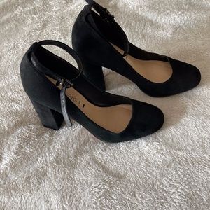 Black suede with adjustable ankle strap, closed toe with chunky heel