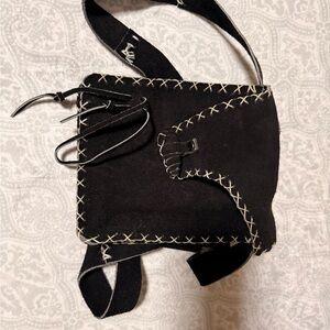 Stylish black suede crossbody bag featuring white stitching. Perfect for everyday use.