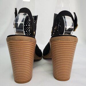Black Suede Dolce Vita Booties, Size 7, Perforated suede upper, Peep toe, round toe, cushioned footbed, adjustable ankle strap, gold detail. 4" Block Heel. Pre-Owned, great condition.