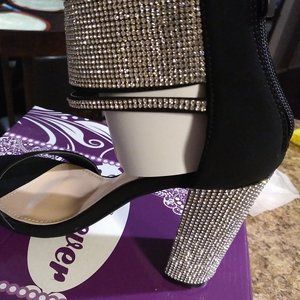 Forever Ladies heels. Ankle strap. Black suede material with Rhinestone embellishments