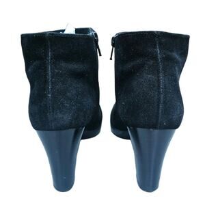 Black sueded leather upper. Short shaft booties hit just above ankle. Round toe, side zip, chunky heel, waterproof construction. Issues noted in photos. Good preowned condition, overall. Size 8M by La Canadienne. Style: 32658