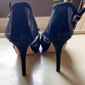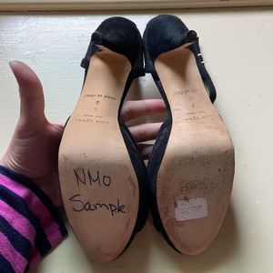 Adorable black mesh striped bow heels from Kate Spade. Have suede bottoms. Made in Italy. In excellent used condition. Were a gift, but they were too small for me unfortunately. T strap Mary Jane style with an adjustable ankle strap, and a slightly stacked foot bed. The heel tips are in really good condition and barely used.