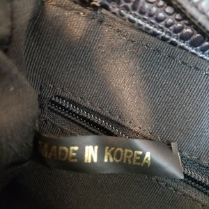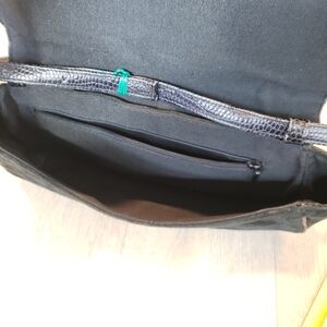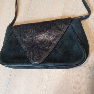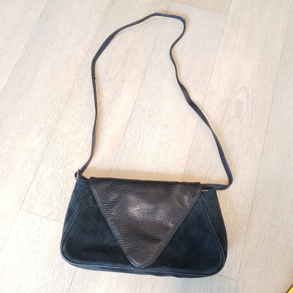 Stylish black crossbody bag with suede and leather textures. Perfect for any occasion.