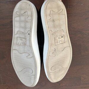 Black leather suede upper, rubber sole. Leather tuxedo bow detail.