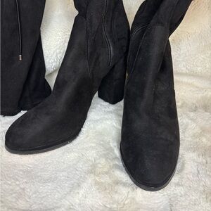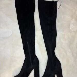 Black suede over-the-knee boots size 9 (although I personally think these are slightly bigger than a true 9) Worn only once…heel was a little too high for me. Heel height approximately 4” other measurements in photos.