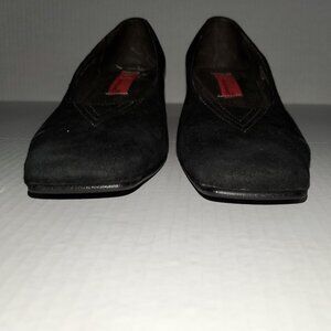 Black Suede Pump w/ Gold Trim, Block Heel, and Square Toe