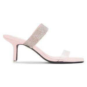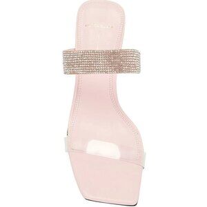 A glittering top strap brings a glamorous vibe to a sleek sandal set on a slender heel and completed with an angular square toe.